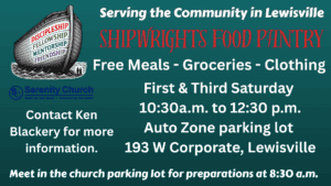 On the 1st and 3rd Saturday of each month, the Shipwrights Food Pantry provides a hot meal, groceries and other items for those facing food insecurity in Lewisville and the surrounding area.
